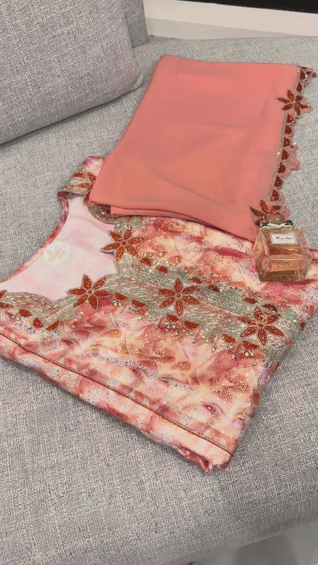 Radiating the brilliance of coral reefs, our "Morjan" Mikhwar glows in rich shades of orange and gold. Its flowing silhouette is adorned with intricate embroidery and subtle beadwork, reflecting the warmth of sunlight dancing on the sea. A luminous outer layer cascades gracefully, framed with delicate floral accents that add depth and sophistication. Designed to captivate at any occasion, the "Morjan" Mikhwar is a vibrant celebration of timeless beauty.